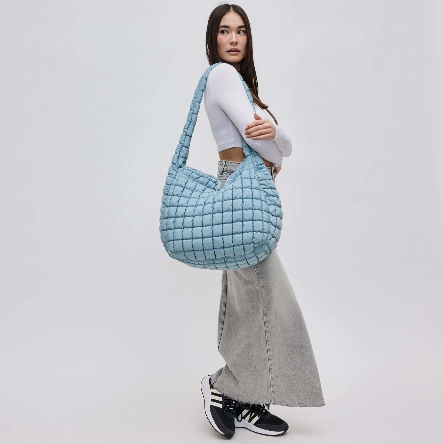 Revive your style with the Revive Puffy Quilted Nylon Hobo. Crafted with utmost attention to detail, this chic and versatile bag combines functionality with a trendy design. Elevate your look and carry all your essentials in style with this must-have bag. * Item Type: Hobo * Material: Nylon * Closure: Top Zip * Interior Details: 1 Mesh Zippered Pocket, 1 Slip Pocket * Exterior Details: 2 Zippered front pockets * Imported * Dimensions: 17” L x 6.5” W x 14” H